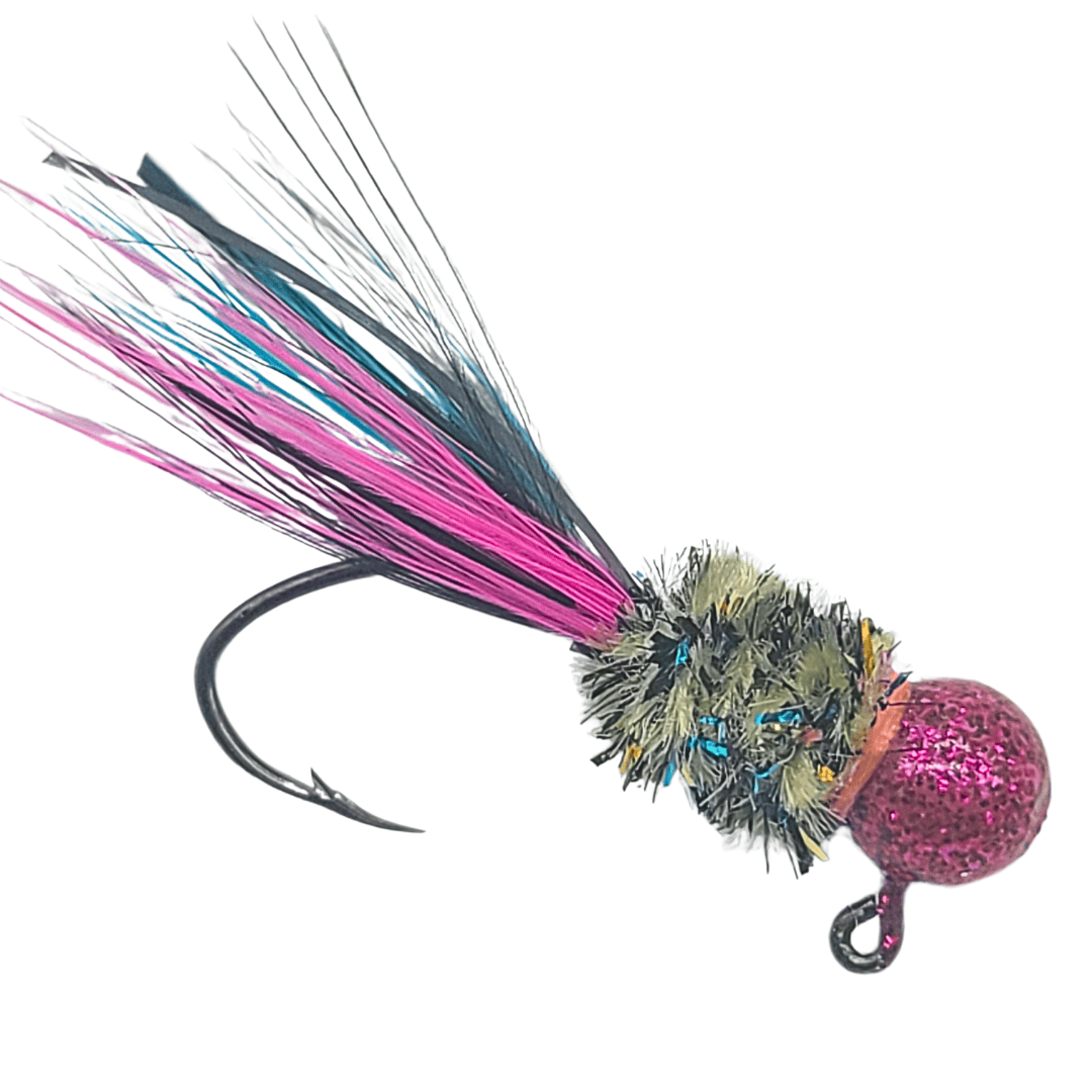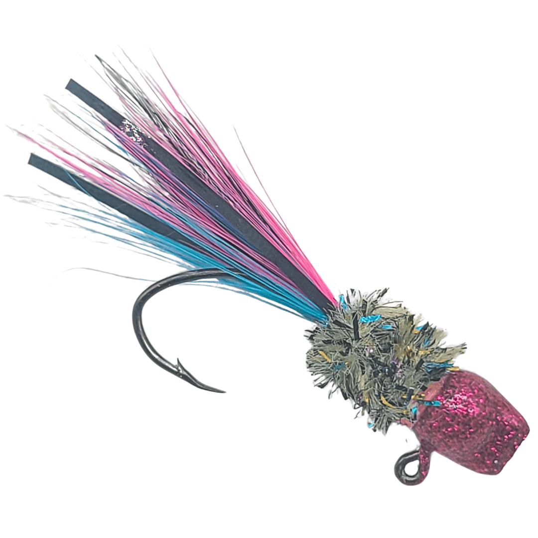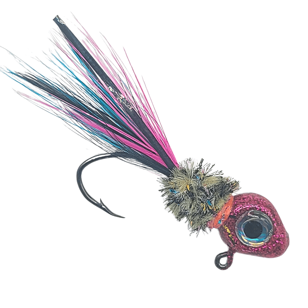 "Hand tied crappie jig with a multicolored feather tail featuring shades of blue, purple, and black, a bright green sparkly body made of synthetic material, and a round red jig head with a prominent eye detail. This crappie lure features a sickle hook, designed to attract fish by mimicking the appearance and movement of prey in the water, making it an effective and visually appealing bait for crappie fishing. This fishing lure is hand tied by Ramble Tamble Tackle."